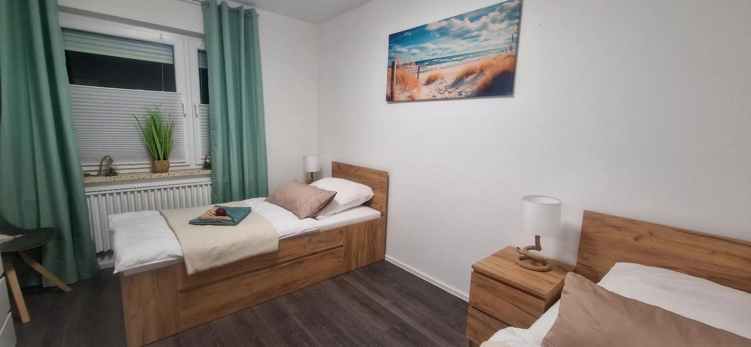 je zwei Einzelbetten, auf Wunsch als Doppelbett (200 × 200 cm) stellbar. Zusammen mit dem Schlafsofa finden bis zu 5 Gäste bequem Platz.