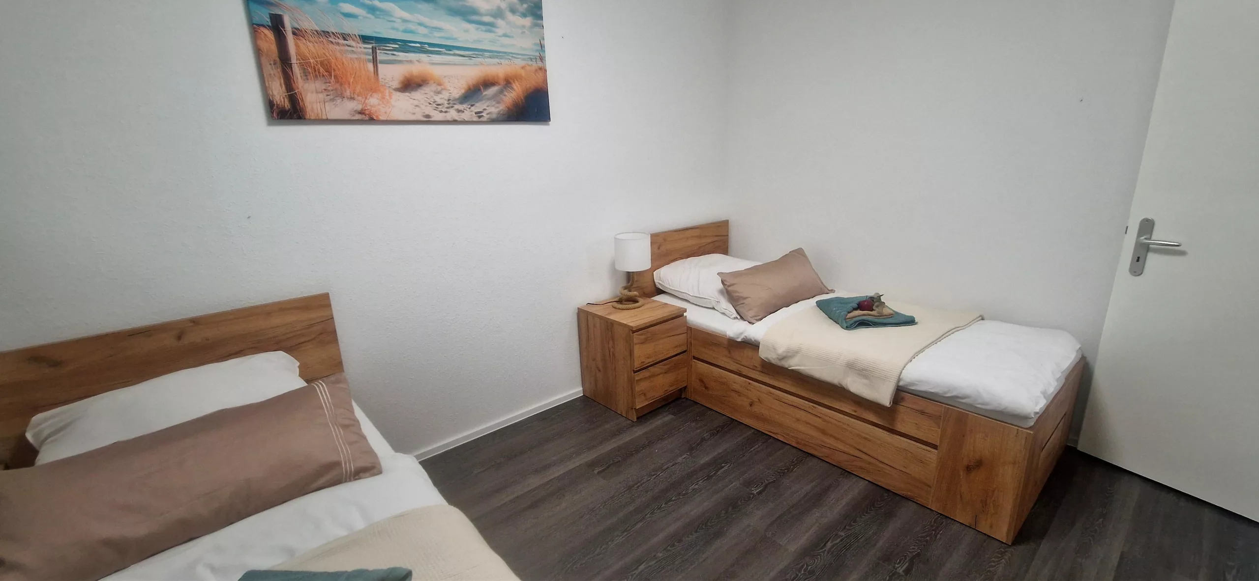 Zwei Schlafzimmer mit je zwei Einzelbetten; auf Wunsch als Doppelbett (200×200 cm) gestellt. Zusätzlich ein großes Schlafsofa im Wohnbereich.