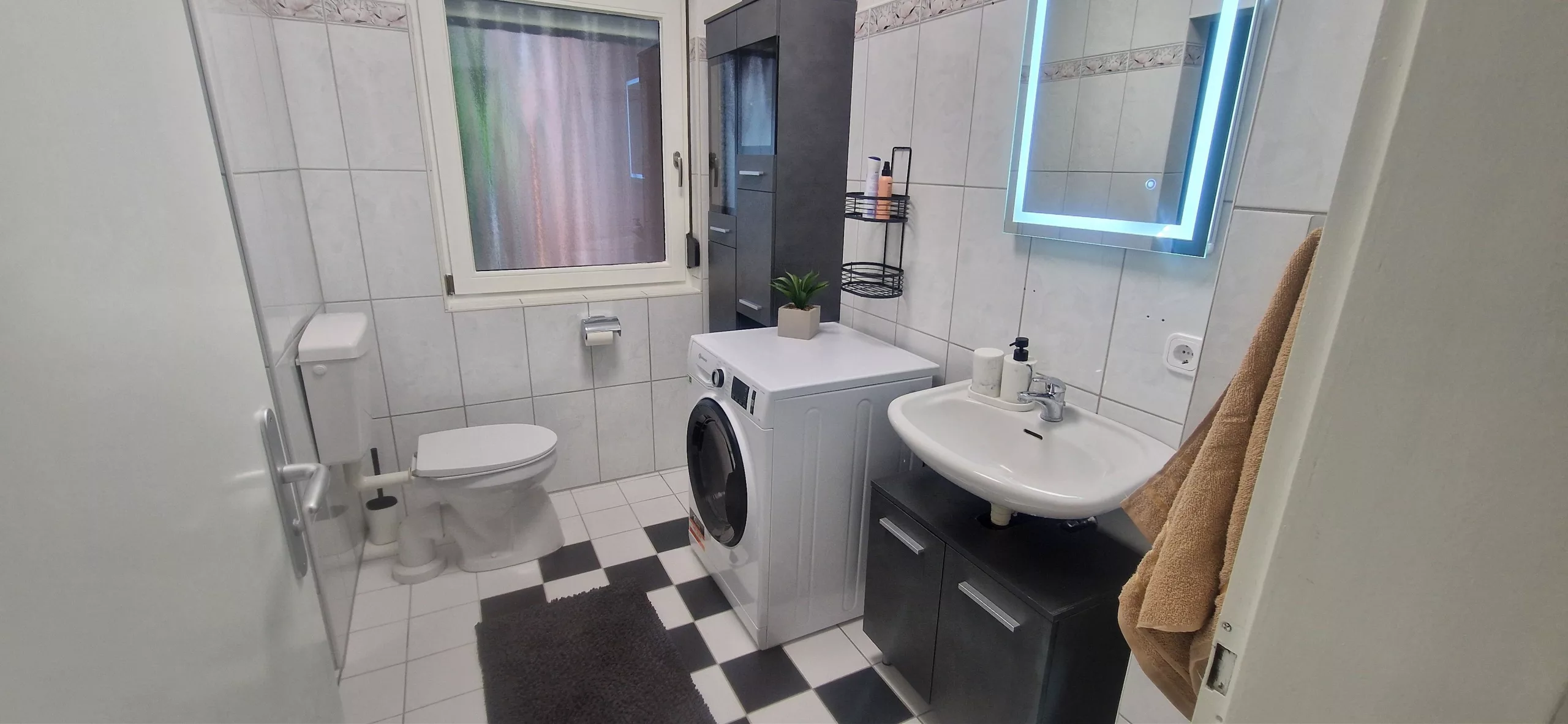 Modernes Duschbad mit WC, Waschtisch und Waschmaschine. Praktisch für längere Aufenthalte.